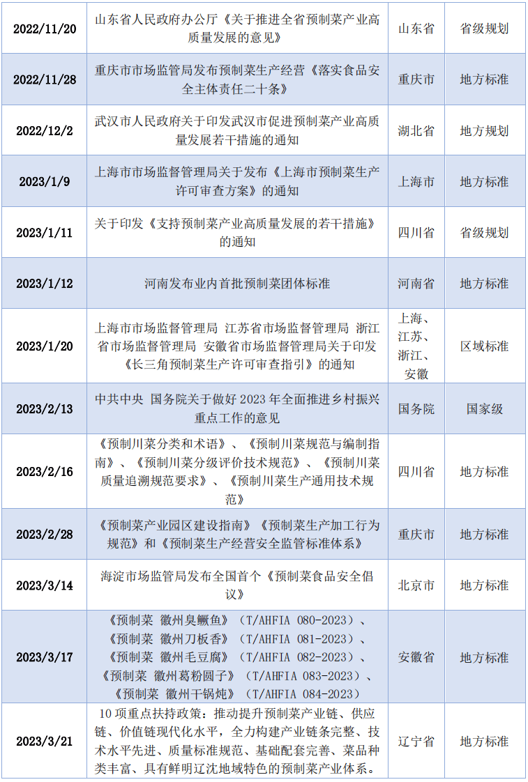 2022年以来,广东、山东、四川、沉庆、福建、浙江、江西、上海、辽宁等多个省市接踵出台预制菜相关财产的政策指点文件,内容次要环绕冷链扶植、企业培育、税收优惠、人才培育、消费补助、品牌打制、财产园扶植和办理等方面。从地方四处所,预制菜财产相关的尺度规范也连续出台。2022年6月,中国饭馆协会发布《预制菜质量分级及评价》和《预制菜出产质量办理手艺规范》集体尺度,为预制菜的尺度化出产供给了支持;2022年5月,江苏省餐饮办事尺度化手艺委员会、江苏省餐饮协会牵头发布《预制菜点质量评价规范》集体尺度;2022年11月,市场监管局发布预制菜出产运营《落实食物平安从体义务二十条》;2023年1月,上海市市场监视办理局关于发布《上海市预制菜出产许可审查方案》的通知等。