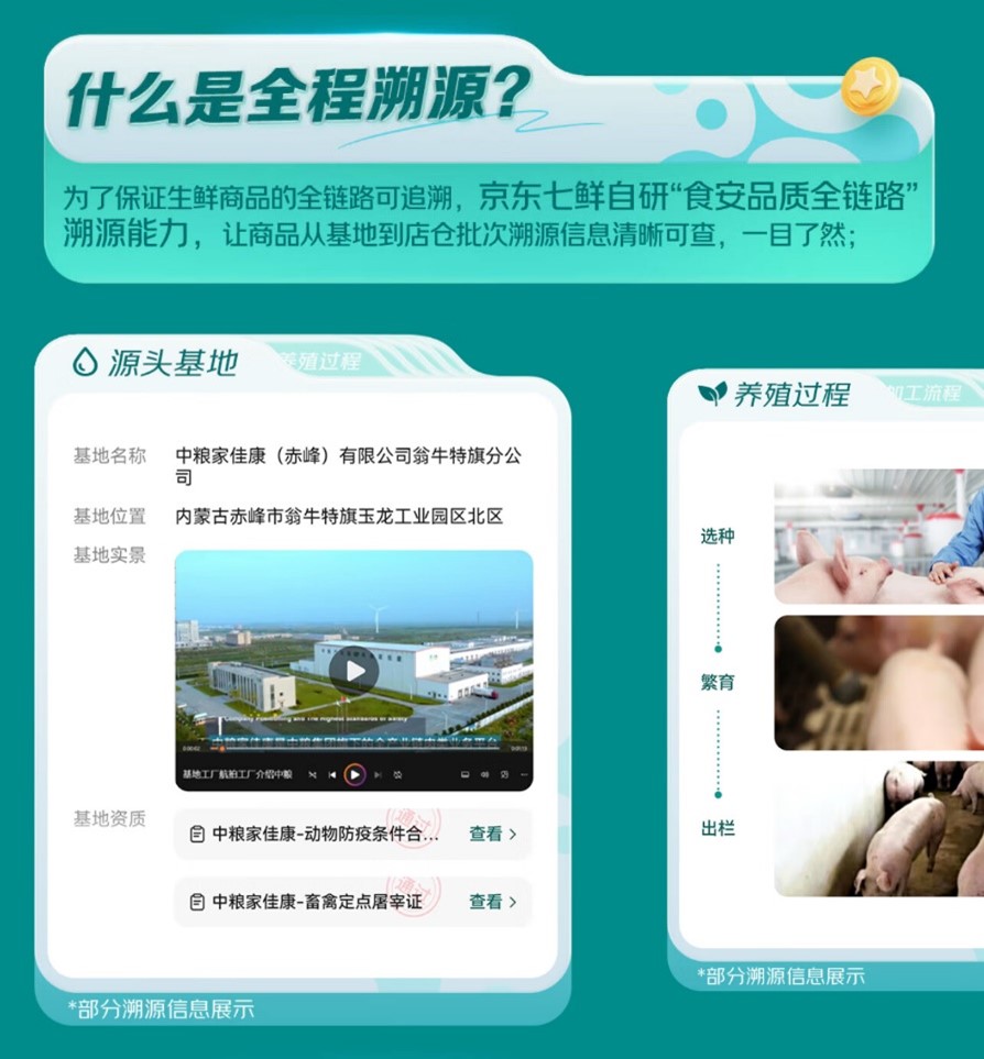目前,京东七鲜App取小法式已上线数十款支撑“全程溯源”的生鲜商品,涵盖肉类、海鲜、蔬菜、生果等多个品类。以180天白猪冰鲜猪肋排、深海野逛大黄鱼、富硒菠菜苗、庞各庄头茬小西瓜等为例,正在泉源管控环节,能够逃溯到种植/养殖具体、各类天分证明、出厂检测演讲;物流运输环节,能够实现运输体例取运输温度监测记实;入库仓储部门,能够实现入库质检成果、检测演讲的系统化留存;城市配送、门店发卖等环节则实现了商品流、温度、进店检测演讲等全环节记实及。六大畅通环节消息完整,形成实正意义上的“端到端”保障。